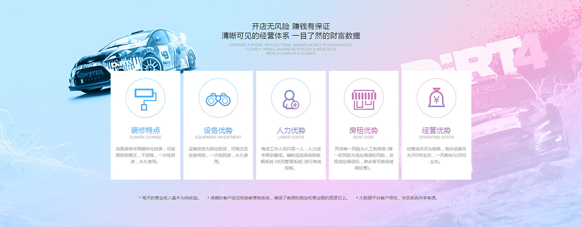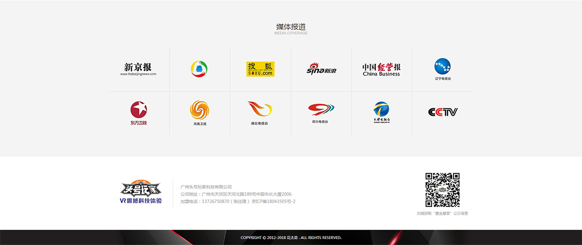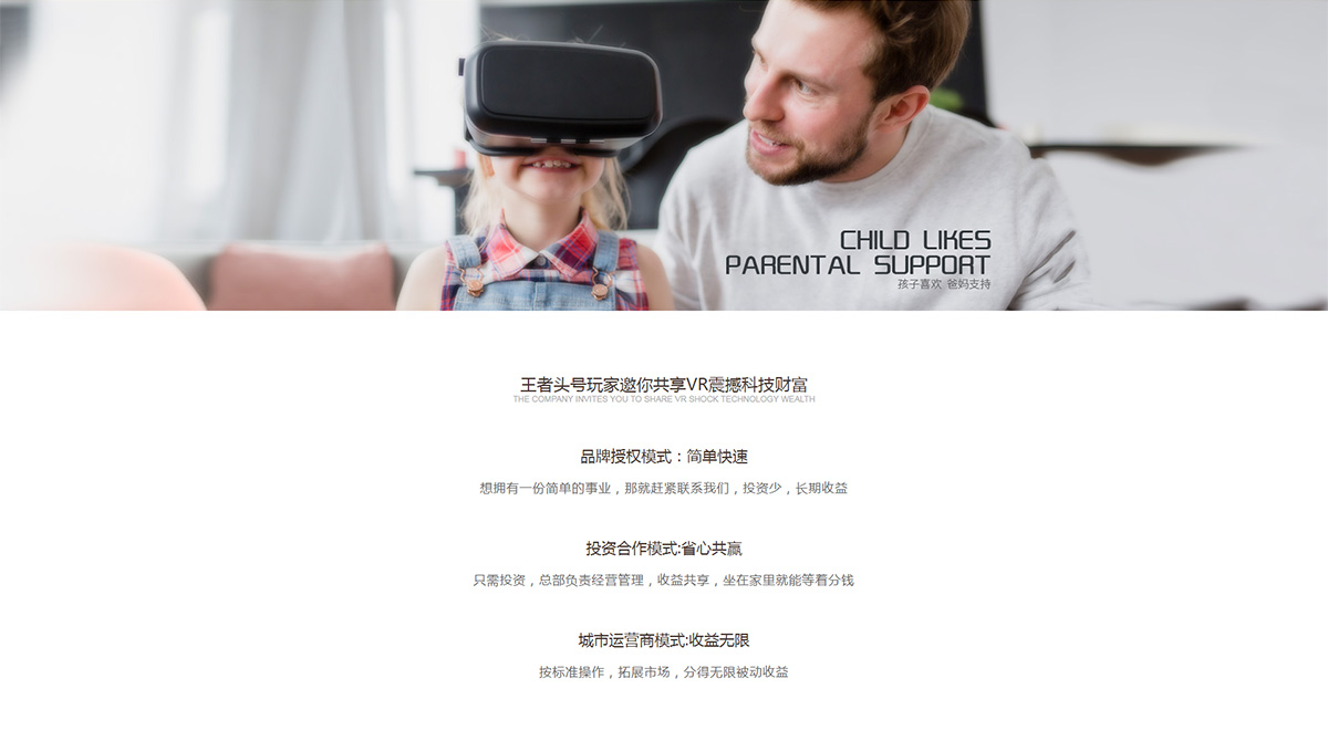 描述:“王者頭号玩(wán)家”是北京花(huā)太奇科技有限公司旗下(xià)的品牌,以“打造中(zhōng)國(guó)VR體(tǐ)驗連鎖第一(yī)品牌”為經營目标,采用自(zì)營、聯營、加盟等多種模式,依托于四個(gè)核心運營中(zhōng)心在中(zhōng)國(guó)大陸、港澳台人(rén)口密集、消費能力較 強的城市(shì)或地(dì)(dì)區招募城市(shì)運營商、加盟商,公司與合夥人(rén)一(yī)起為每個(gè)地(dì)(dì)方打造1-100家不(bù)同規模的體(tǐ) 驗店,讓盡可能多的人(rén)零距離(lí)接觸VR高科技産品,感受科技創新的力量、愉悅身心。