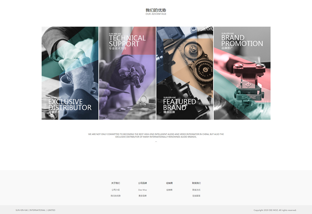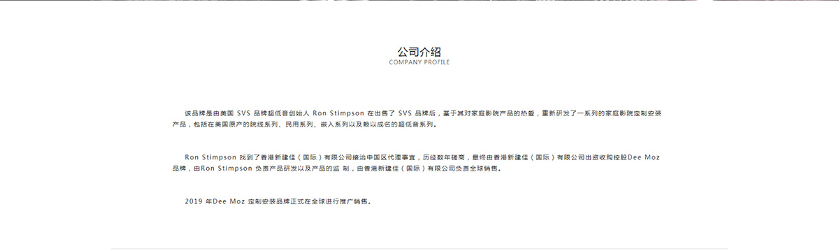 描述:新建佳是由美(měi)國(guó) SVS 品牌超低(dī)音創始人(rén) Ron Stimpson 在香港找到的新建佳(國(guó)際)有限公司接洽中(zhōng)國(guó)區代理事宜,曆經數年磋商,最終由香港新建佳(國(guó) 際)有限公司出資收購控股Dee Moz 品牌,由Ron Stimpson 負責産品研發以及産品的監 制(zhì),由香港新建佳(國(guó)際)有限公司負責全球銷售。